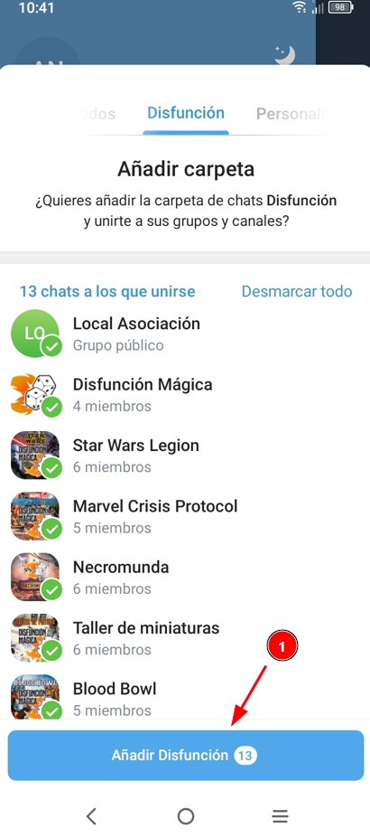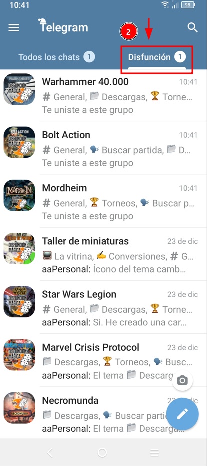 Arriba, donde pone Todos los chats, pulsa la pestaña Disfunción para ver solo los chats de la asociación. Hay saldrán los canales de Disfunción y podéis «olvidaros» del resto de chats si no usáis Telegram normalmente.