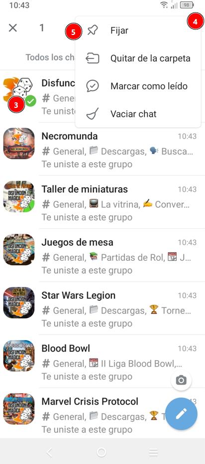 Busca el canal Disfunción Mágica, mantén pulsado encima y se marcará con un check verde (✅), pulsa «los 3 puntos» que aparecen arriba a la derecha y pulsa Fijar (📌) para que quede siempre el primero.